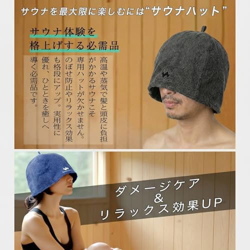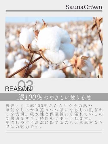 【綿100%!洗濯機で楽々お手入れ】表裏ともに綿100%素材だからサウナの熱や蒸気をしっかり遮りつつ頭にやさしい肌ざわりを実現。吸水性と保温性に優れ、ゴムバンド付きで頭にフィットするため、快適なサウナタイムをサポートします。