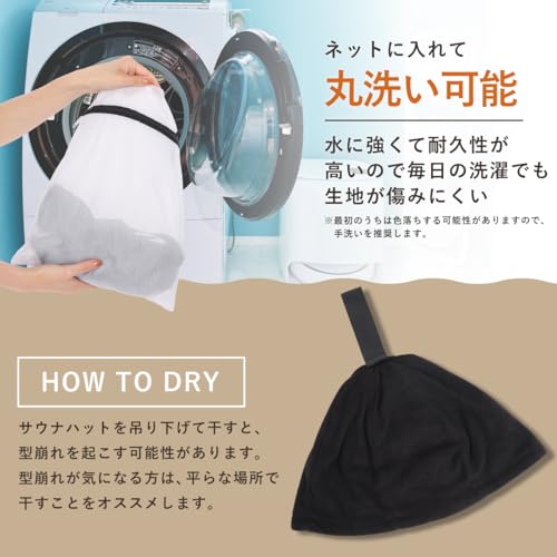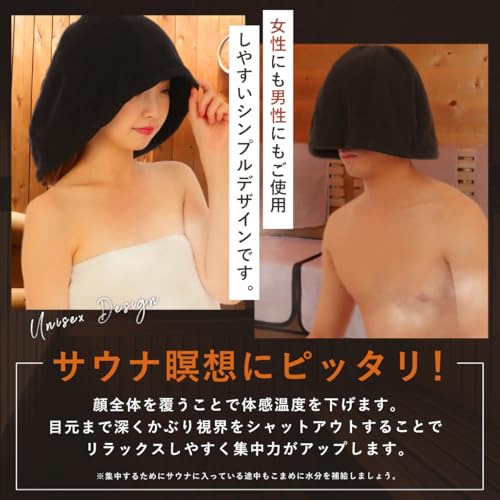 深くかぶれる大きめサイズ。 深くかぶることでサウナの熱から頭皮、髪、顔へのダメージを軽減。 視界を遮り集中力アップ。