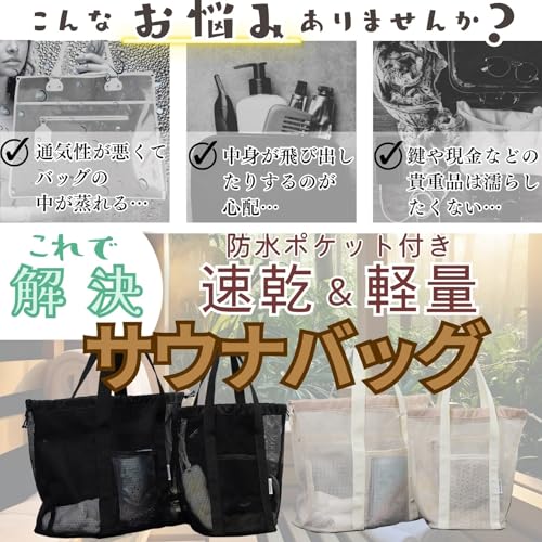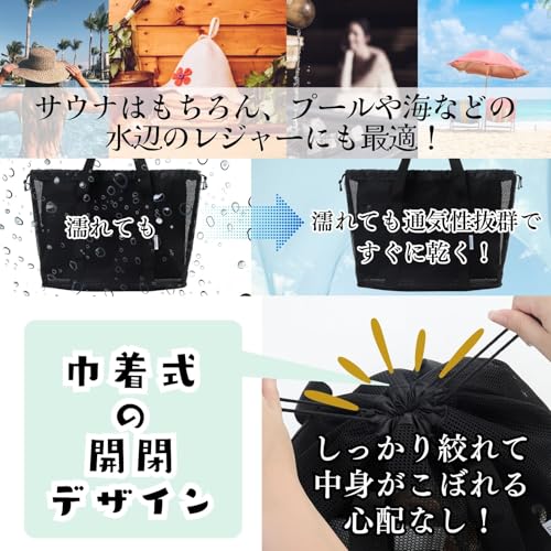 三八商店 スパバッグ メッシュバッグ 防水ポケット付き 温泉バッグ サウナ ジム 銭湯 水泳 プール ジム 温泉 大人 お風呂 トート (Lサイズ, ブラック)