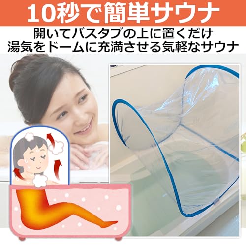 【10秒で簡単サウナ♪】自宅のお風呂が10秒で簡単にサウナになります。開いてバスタブの上に置くだけで、お湯から出る湯気がドーム内に広がり、サウナのようになります。時間が無い時でも、バスタブに浸かりながら人目を気にせず、のんびりサウナを楽しめます。