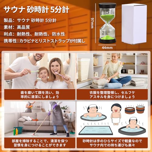 【カラビナとリストストラップ付き】この5分砂時計にはカラビナとリストストラップが付属しており、持ち運びに便利です。サウナの予熱時間は5~10分が推奨されています。最適なサウナ状態になるまで、必要に応じて1~2回計時できます。